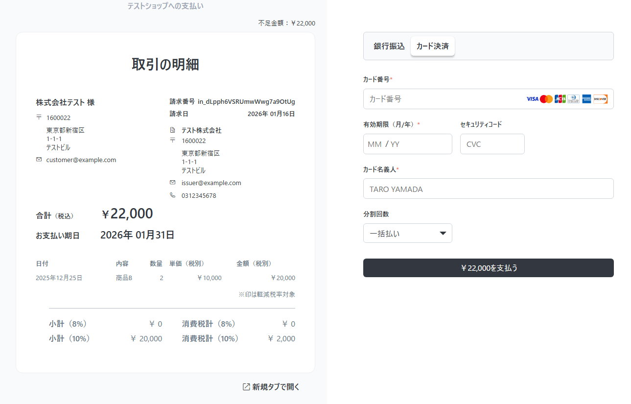 テスト環境でインボイスを発行したら、レスポンスに含まれる invoice_url をブラウザで開いてみてください。